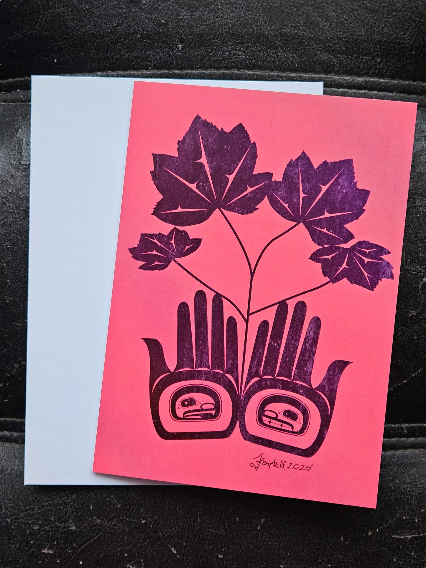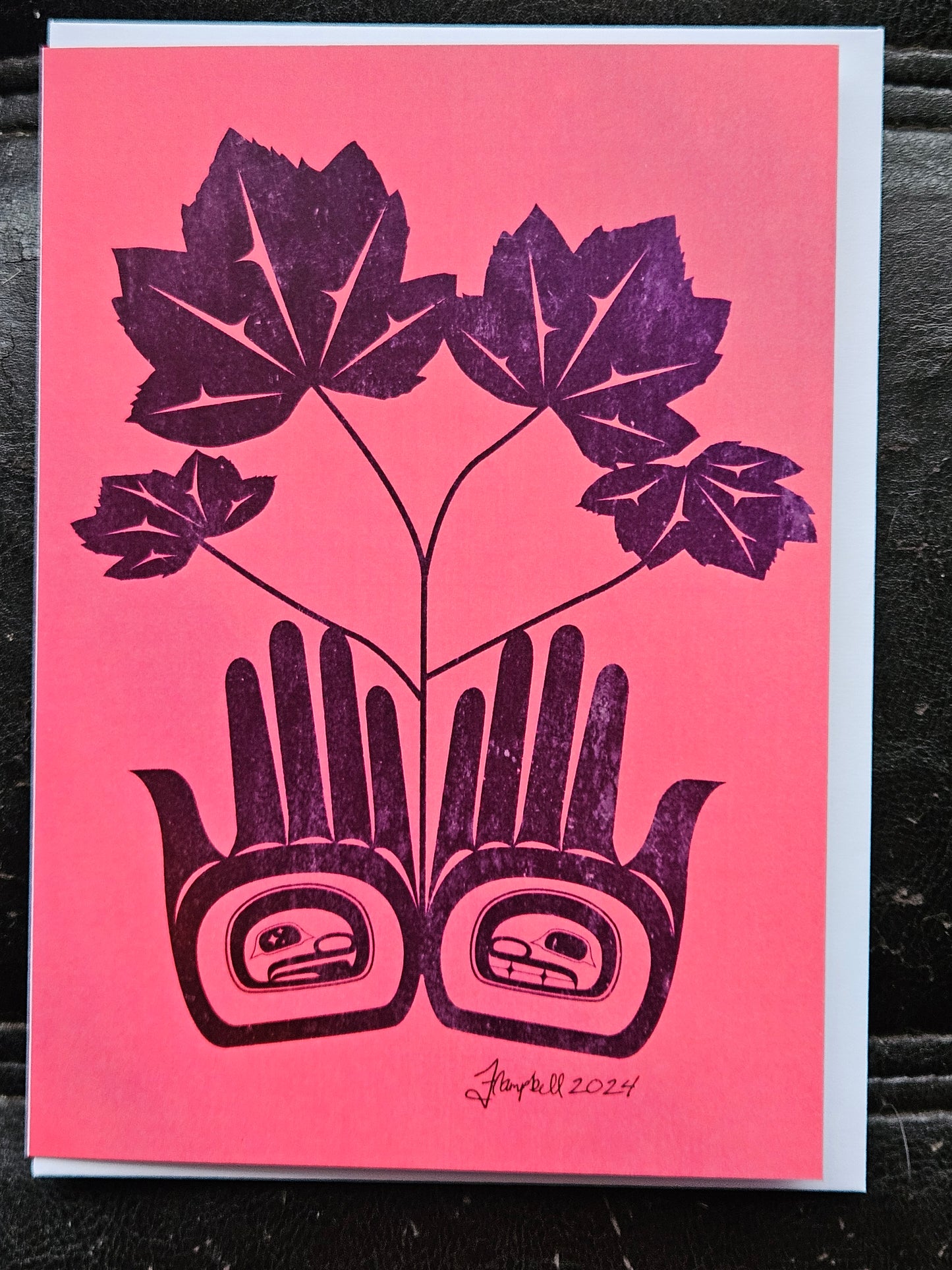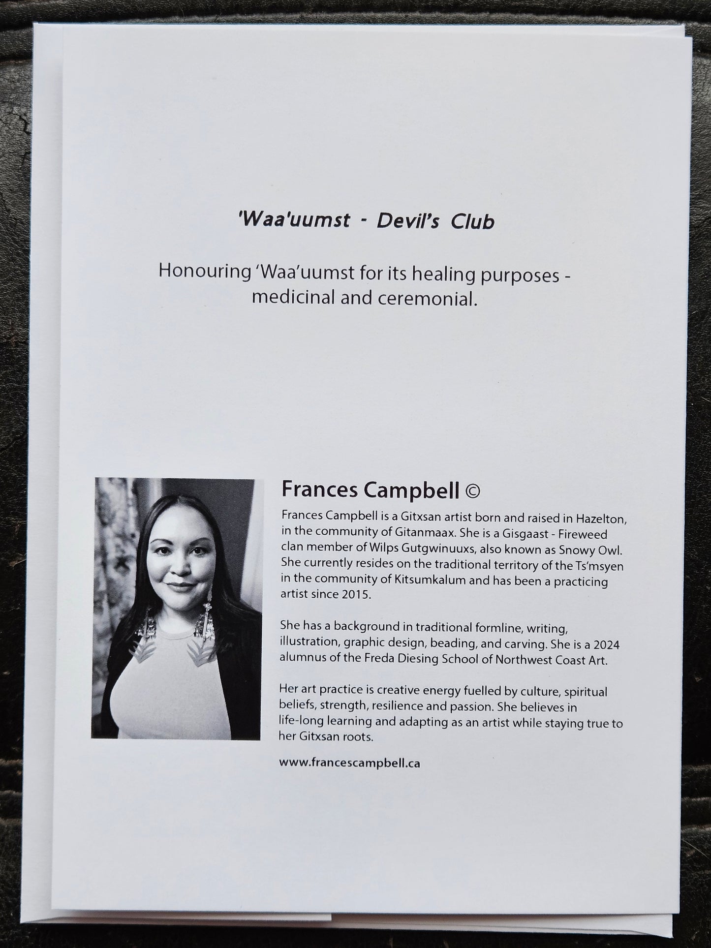Celebrate 'Waa'uumst, the Devil's Club, with our 5x7 Greeting Card. Its blank inside allows you to personalize its use. Adorned with traditional Gitxsan formline art, this card is perfect for honouring this medicinal and ceremonial plant known for its healing properties.