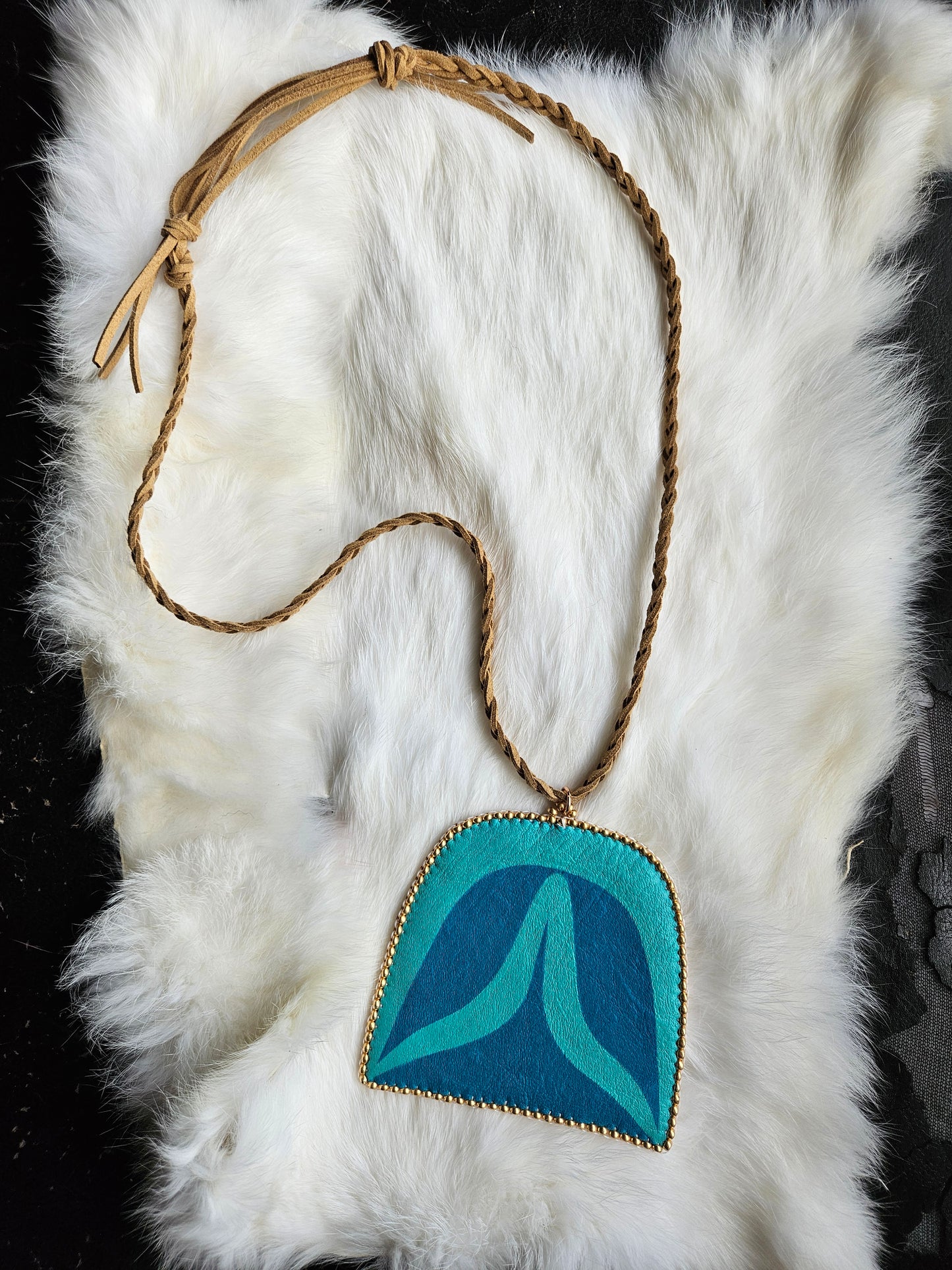 Indulge in the sophisticated elegance of our Split-U Leather Pendant. Adorned with a hand-painted Gitxsan formline split-u design, this double-sided pendant features luxurious turquoise and tan leather, embellished with size 8 gold seed beads. Complete the look with the braided suede necklace cord for a truly exclusive statement piece.
